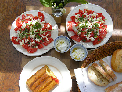 Tomaten mit Schafskäse & Bärlauch, Hüttenkäse mit Leinöl für die Zellen :) und Bratwurstsülze.